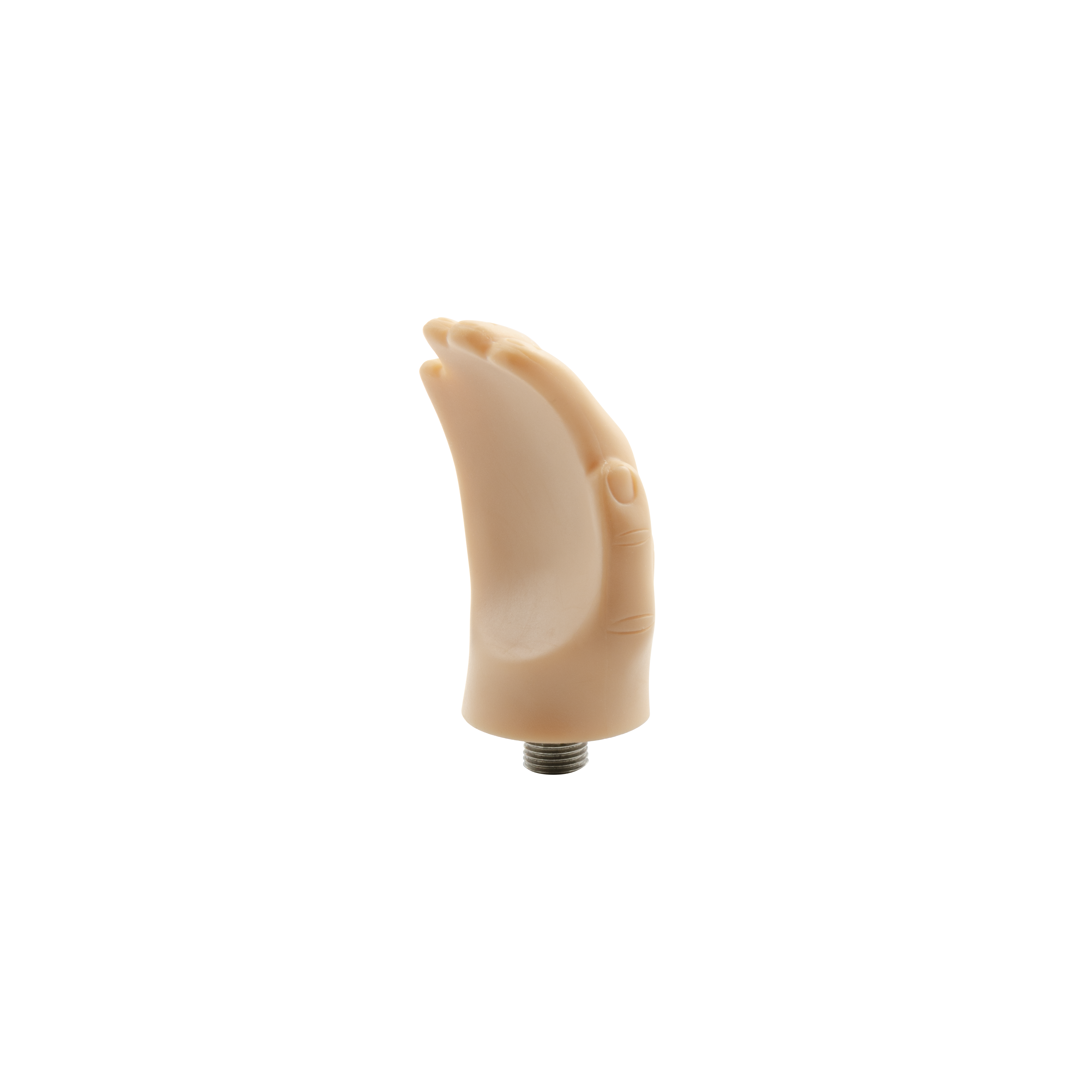 The Free Flex Hand is designed to enable two-handed performance in all types of recreational and athletic activities, especially those in which player contact and collision can occur, or where more expensive prosthetics are not wanted/allowed. This passive hand is made of flexible but strong, polyurethane elastomer with stainless-steel and aluminum cores allowing it to flex and extend with external pressure and absorb shock then return to its normal shape. Realistic anatomical features are molded into the back of the hand with a cupped surface on the front. Successful application can be expected in basketball, soccer, football, volleyball, skating, jogging, aerobics, dance, martial arts and more. It has a standard ½ inch diameter mounting connector to fit most standard wrist openings. Available in 4 sizes, left and right: FF4R/L (2-6 years), FF3R/L (6-13 years), FF2R/L (13-Adult), FF1R/L (Adult). Colors: Tan, Medium Brown, and Dark Brown.